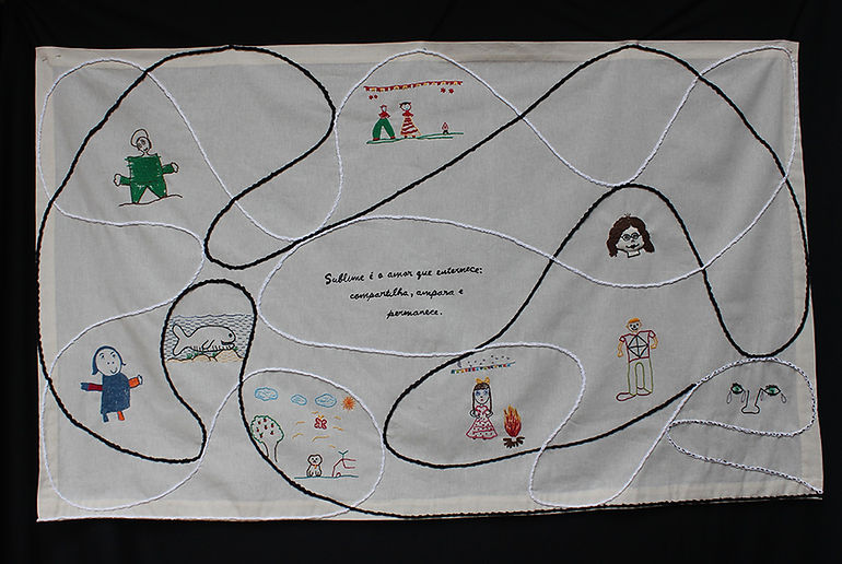 São restos de memória familiar resignificando morte e vida em tramas, em forma de labirinto, com desenhos guardados de cada filho.